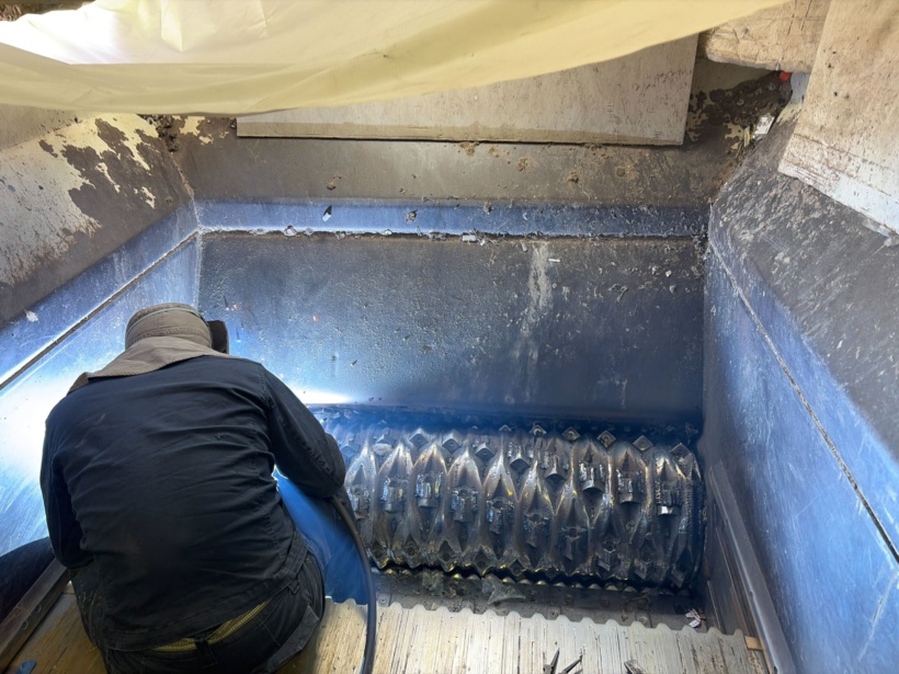 この一軸破砕機は特に大きな機種なので、肉盛りの量もとっても多くて大変ですが丁寧かつスピーディーに、手際良く溶接を行っていきます!
